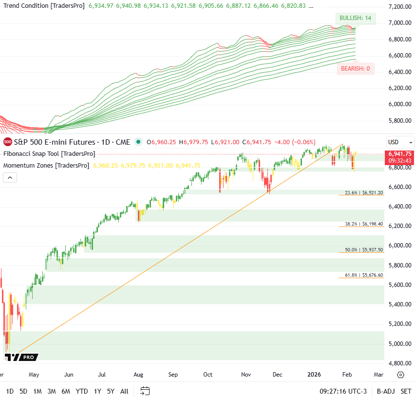 S&P 500 futures are pulling back from recent highs, with price slipping lower intraday while the broader trend structure remains firmly bullish.