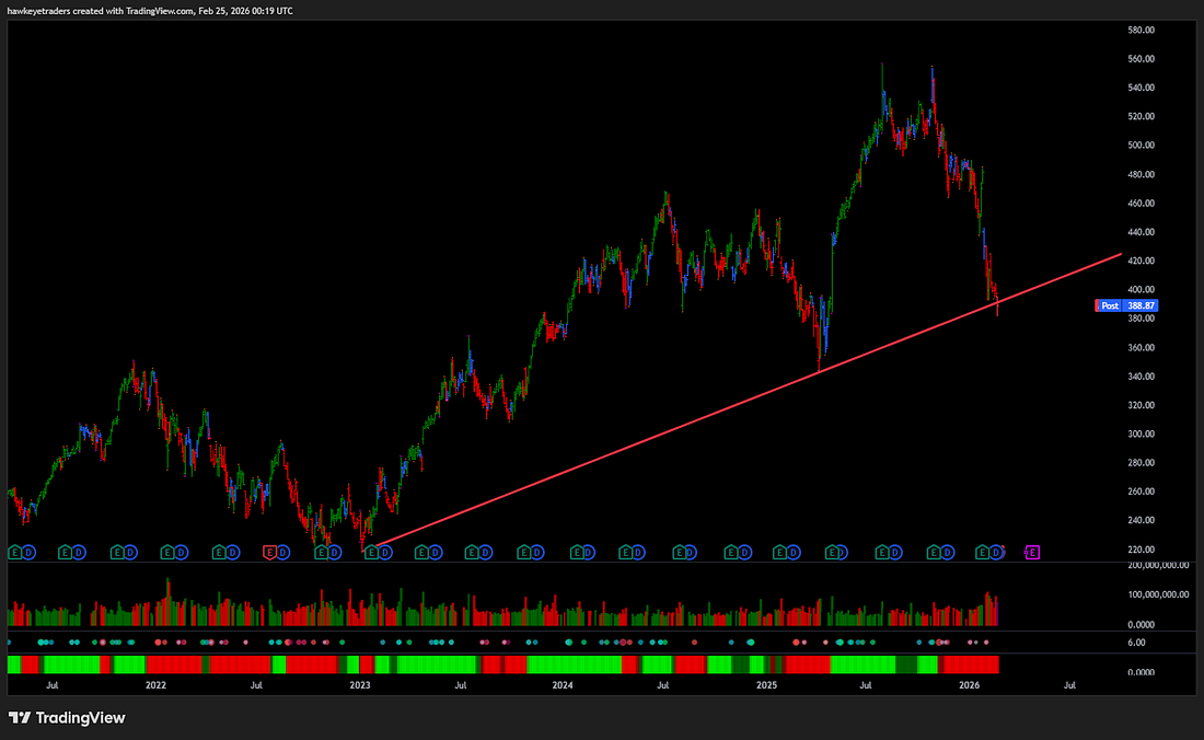 Its cloud division sits at the center of AI compute demand. Its productivity suite is becoming AI-native. Its enterprise contracts provide multi-year visibility. This is not narrative exposure. This is tollbooth exposure. And tollbooths do not disappear because sentiment wobbles. How Far Off the Highs?Shares have pulled back over 30% from peak levels reached during peak AI enthusiasm. That compression has brought valuation back toward historical norms. More importantly, price is now sitting on a multi-year structural trend line that has repeatedly attracted institutional buyers. We do not need to call the exact bottom. We need to recognize when dominant franchises are discounted. The Insider SignalOn February 18, a director purchased: 5,000 shares Not compensation. A deliberate purchase during weakness. Insiders buy for one reason. They believe the forward trajectory is stronger than the current price reflects. The StrategyAccumulate Strength During WeaknessWe are not attempting to time a bottom tick. Instead, we are building into weakness. When structurally strong companies sell off into long-term support, that is when capital should scale in. If price stabilizes above the current trend line, we participate. If volatility extends, we add at stronger levels. Buying quality into fear eliminates the need for precise timing. Catalysts AheadOver the next 60 to 120 days: