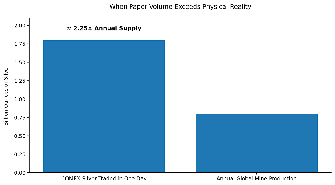 Is Now the Time to Buy Silver?Understanding the gap between paper stress and physical demand offers a roadmap through the current chaos.Most people think “price” is the truth. In markets, price is often just the last print in a much bigger fight. And on Friday, that fight got loud. Because while silver’s paper price was getting crushed, something else happened quietly in the background that should make you stop and think: Physical buyers did not panic. They stampeded. The result was one of the clearest tell signals you will ever see when markets are stressed. Not a normal selloff. Not a normal dip. A forced event. And those events always leave fingerprints. The Number That Should Not ExistStart here. A reported 1.8 billion ounces of silver traded on COMEX in a single day. Annual global mine production is commonly estimated around 800 million ounces. Even if you do nothing else with those numbers, you should feel the problem. How does “more than a year’s worth of global output” change hands in hours without the physical market instantly reflecting it? Simple. Because it did not. That volume was not about people buying silver. It was about positioning, leverage, and paper. The Retail Signal That Matters More Than a ChartNow compare that paper storm to what happened at the street level. One major precious metals dealer reported that physical silver demand surged to roughly 2.5 times its prior all-time record on the same day silver was smashed. That prior record, according to the same narrative, was set during the Silicon Valley Bank panic. Think about what that implies. When fear hit the tape, retail did not run away. Retail treated it like a fire sale. That is not how a normal “bubble top” behaves. At tops, buyers vanish. Dealers get stuck with inventory. Premiums collapse. Here, the opposite behavior showed up. The market dropped, and buyers showed up in force. That is a very specific kind of signal. It often appears when price is being set by liquidations, not by fundamentals. Why “Massive Volume” Can Be a Red FlagMost investors see huge volume and assume “real interest.” Sometimes that is true. But sometimes huge volume is exactly what it looks like when a market is being used as a pressure valve. Here is the mechanic. In a leverage-driven unwind, big players do not sell what they want to sell. They sell what they can sell. They hit the most liquid venues. They trigger stops. They force weak hands out. They create a cascade. Then, once the cascade does its job, they flatten out. What matters is not just the volume. It is what happens to open interest and positioning after the volume hits. When enormous paper turnover shows up and positions are closed rapidly into the same session, that is not long-term conviction. That is a hit-and-run. It is the footprint of a market being used to raise cash, manage exposure, or slam price through thin liquidity. And when it happens near a delivery month, it draws even more attention because delivery risk becomes part of the backdrop. The Physical Bottleneck That Price Does Not SolveHere is the part most people miss. Paper can move instantly. Physical cannot. You can trade billions of ounces of paper claims in a day. You cannot mint, ship, and restock real product on that schedule. That is why, in stress events, you get this strange phenomenon: Spot price down hard. That is the disconnect. And it is exactly what you see when the paper market is doing the work of clearing leverage while the physical market is doing the work of revealing scarcity. The Mint Backlog StoryAnother detail in the narrative matters, even if you set aside the drama and treat it as a simple supply-chain signal. Delivery timelines reportedly pushed from a few weeks to multiple weeks, with some sovereign mint products quoted further out than they were a month earlier. That is not a prediction. That is a lagging indicator of demand meeting limited production capacity. Mints do not scale output overnight. Blanks do not appear by magic. Refining capacity is not infinite. So when retail demand spikes right when paper prices drop, the pipeline gets stressed immediately. That is how “cheap spot” can coexist with “hard-to-get product.” Two Competing Stories, One Coming ResolutionAt this point, you have two stories running at the same time. Story one: The paper market says “risk-off, liquidations, get out.” Story two: The physical market says “discount, buy it, inventory is tight.” Those stories can coexist for a while. But they do not coexist forever. Eventually one side forces the other to adjust. And this is the part that should keep your attention. When a market’s paper volume can dwarf real-world production, the system is stable only as long as most participants treat the contract as a trading chip, not as a claim. When too many people want the claim to behave like a claim, the structure gets tested. That does not mean a breakout is guaranteed tomorrow. It means the pressure is building in the one place that cannot be faked: availability. What I’m Watching NextIf you want to approach this like a professional and not like a social media spectator, focus on a few simple tells... Keep reading with a 7-day free trialSubscribe to Market Traders Daily to keep reading this post and get 7 days of free access to the full post archives. A subscription gets you: