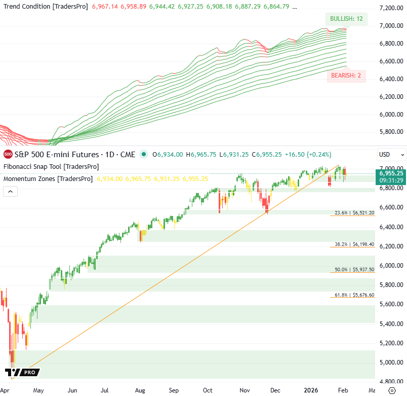 S&P 500 Firms Up As Buyers Maintain Structural EdgePrice action suggests consolidation near highs rather than distribution, with buyers still defending key structureFollow a Proven Stock Trading Plan Market Overview: Bullish/Bearish Trend Analysis Trend Condition: Bullish Trends: 12 Bearish Trends: 2 Trend Condition: Strong Uptrend Trend Structure: wide and flattening near the top Probability Outlook: Price Action and Momentum Zones Current Price and Change: Currently, the S&P 500 Futures are at approximately 6,955, up about 17 points or roughly 0.24% versus the prior session shown on the chart. Market Behavior: Today’s candle is green with a modest range, showing buyers maintaining control but with less urgency than during prior impulse advances. Momentum Zones: Price is holding within the upper momentum zone and remains above the 23.6% retracement, keeping the market aligned with bullish structure rather than corrective territory. Overall Market Interpretation: Follow a Proven Stock Trading Plan TrendCycle Daily |