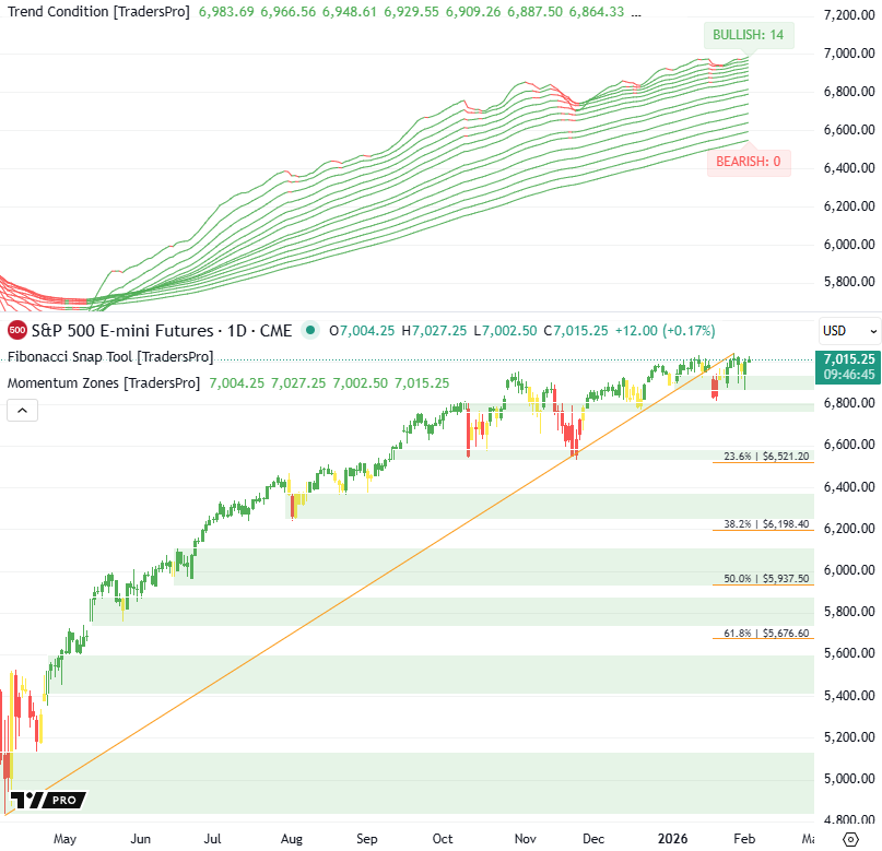 S&P 500 Rebounds As Full Bullish Trend Reasserts StrengthHolding above the shallowest retracement keeps price firmly in bullish territory, with deeper Fibonacci levels remaining distant and untested, reinforcing trend dominance.Follow a Proven Stock Trading Plan Market Overview: Bullish/Bearish Trend Analysis Trend Condition: Bullish Trends: 14 Bearish Trends: 0 Trend Condition: Strong Uptrend Trend Structure: wide and rising Probability Outlook: Price Action and Momentum Zones Current Price and Change: Currently, the S&P 500 Futures are at approximately 7,015, up about 12 points or roughly 0.17% versus the prior session shown on the chart. Market Behavior: Today’s candle is green with a modest range, showing buyers stepping back in after the pullback and reasserting control near the upper end of the recent range. Momentum Zones: Price has moved back into the upper momentum zone, remaining well above the 23.6% retracement and aligned with the prevailing bullish trend. Overall Market Interpretation: Follow a Proven Stock Trading Plan TrendCycle Daily |