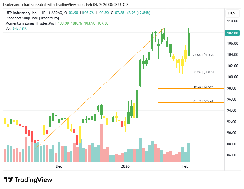 UFP Industries, Inc. (UFPI): Repair And Remodel Demand Remains ResilientAs construction activity evens out, diversified suppliers with exposure to repair, remodel, and industrial markets are finding stability.Follow a Proven Trade Plan UFP Industries, Inc. (UFPI) is a diversified manufacturer and distributor of wood-based products serving construction, industrial, and retail markets. The company operates across residential building materials, industrial packaging, and value-added wood solutions, supplying everything from framing components and decking to packaging systems used in manufacturing and logistics. UFP’s strength comes from its broad end-market exposure and ability to shift production toward areas with the strongest demand. Growth is being driven by steady repair and remodel activity, infrastructure-related demand, and UFP’s continued move toward higher-margin, value-added products. Even as new home construction remains uneven, homeowners continue to invest in upgrades, outdoor living, and maintenance projects. On the industrial side, packaging demand tied to manufacturing and distribution remains resilient, supporting volume stability across cycles. From a technical perspective, the stock’s price action is improving. The chart recently showed a confirmation bar accompanied by increasing volume, signaling renewed buyer interest. That move pushed the stock into the momentum zone, an area where trends often strengthen as demand begins to overpower supply and participation broadens. As momentum builds, managing risk remains important. A trailing stop is a risk management tool that rises as price moves higher, helping protect gains while allowing the trend to continue. Traders often establish trailing stops using Fibonacci retracement levels, which can be applied with a Fibonacci snap tool to adjust stops dynamically as new price structure forms. For more information about this company visit their official website and visit their official website. Trade Stocks with Confidence. Follow a Proven Plan. TrendCycle Daily |