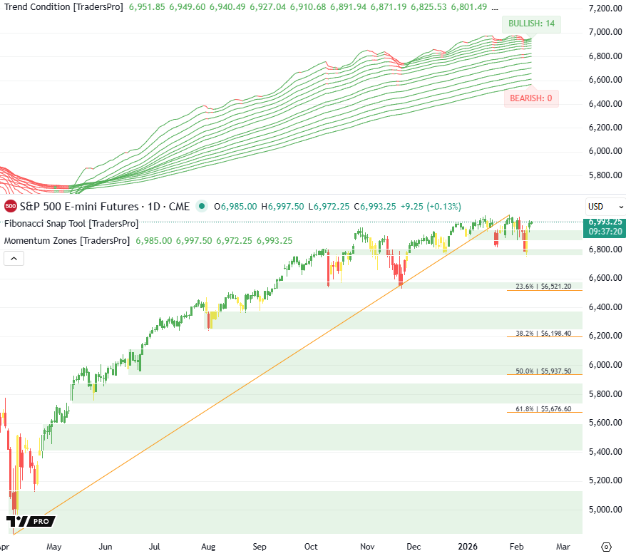 S&P 500 futures are stabilizing after recent volatility, with price holding near the upper range while the dominant uptrend structure remains firmly intact.
