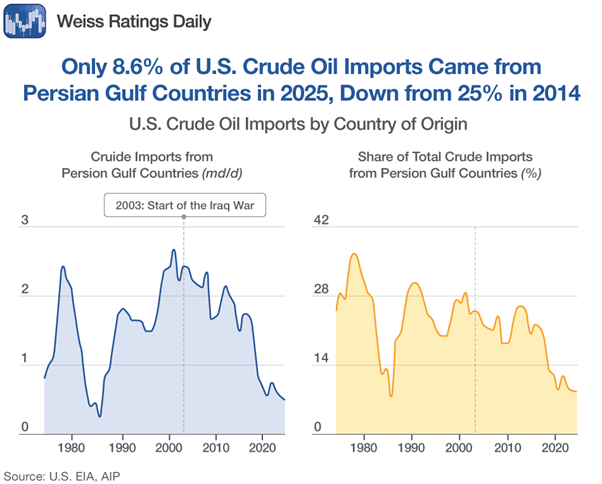 American crude imports from the Persian Gulf have dropped from 25% in 2014 to just 8.6% in 2025.