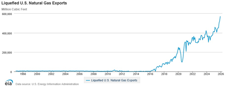 In December — the latest EIA data available — U.S. liquefied natural gas exports soared to 569.3 billion cubic feet. That’s up 39% from the same month a year earlier.
