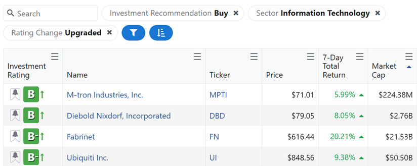 Using the Weiss Ratings Plus Stock Ratings Analyst, I filtered for stocks in the tech sector with rising “Buy” ratings.