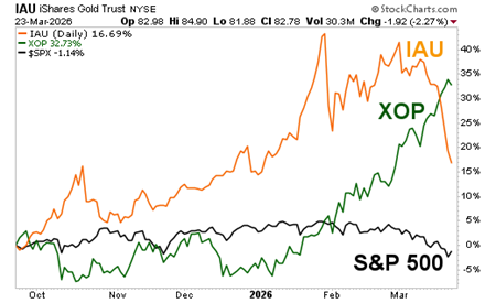You can see that gold and the XOP have both gained over the past six months, though the war knocked gold back temporarily.