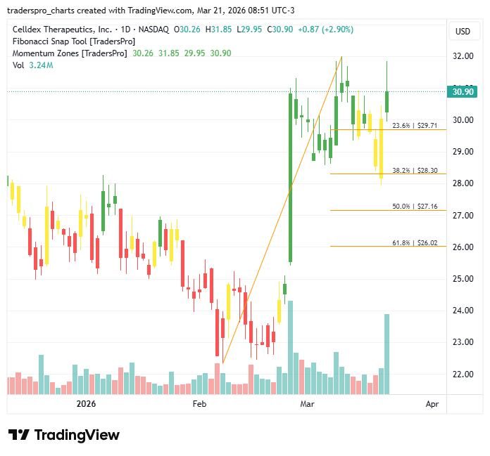 Celldex Therapeutics, Inc. (CLDX): Immunology Pipeline ExpansionAs demand grows for innovative immunology treatments, targeted antibody platforms are gaining increased investor attention.New To TradersPro? Celldex Therapeutics, Inc. (CLDX) is a clinical-stage biotechnology company focused on developing targeted antibody-based therapies for inflammatory diseases and cancer. The company’s pipeline centers on precision biologics designed to modulate specific immune pathways, with lead programs targeting chronic urticaria and other mast cell-driven conditions. Celldex leverages deep immunology expertise to pursue differentiated mechanisms that aim to improve efficacy and patient outcomes compared to existing standards of care. Growth is being driven by positive clinical momentum and expanding investor interest in immunology-focused biotech platforms. As autoimmune and inflammatory diseases remain large, underserved markets, novel antibody therapies that show meaningful symptom control have the potential to capture significant attention. Recent trial updates and continued pipeline advancement have supported renewed visibility, especially as capital flows gradually return to selective biotech names. Healthcare innovation remains a structural growth theme, even amid shifting macro conditions. Demand for new immunology treatments tends to be less sensitive to economic cycles, supported by regulatory incentives and strong patient advocacy engagement. As larger pharmaceutical companies look to strengthen immunology portfolios, differentiated late-stage assets can become attractive partnership or acquisition candidates. On the chart, shares recently printed a confirmation bar with increasing volume, signaling stronger buyer participation. That move pushed price into the momentum zone, where expanding demand often sustains upside as available supply becomes limited. Because clinical-stage biotech stocks can experience sharp moves around trial data and regulatory events, risk management is critical. A trailing stop rises alongside price, helping protect gains while allowing participation in the broader trend. Traders can anchor that stop to Fibonacci retracement levels and adjust it using the Fibonacci snap tool as new highs form, creating a structured and disciplined approach. For more information about this company visit their official website. New To TradersPro? TrendCycle Daily |