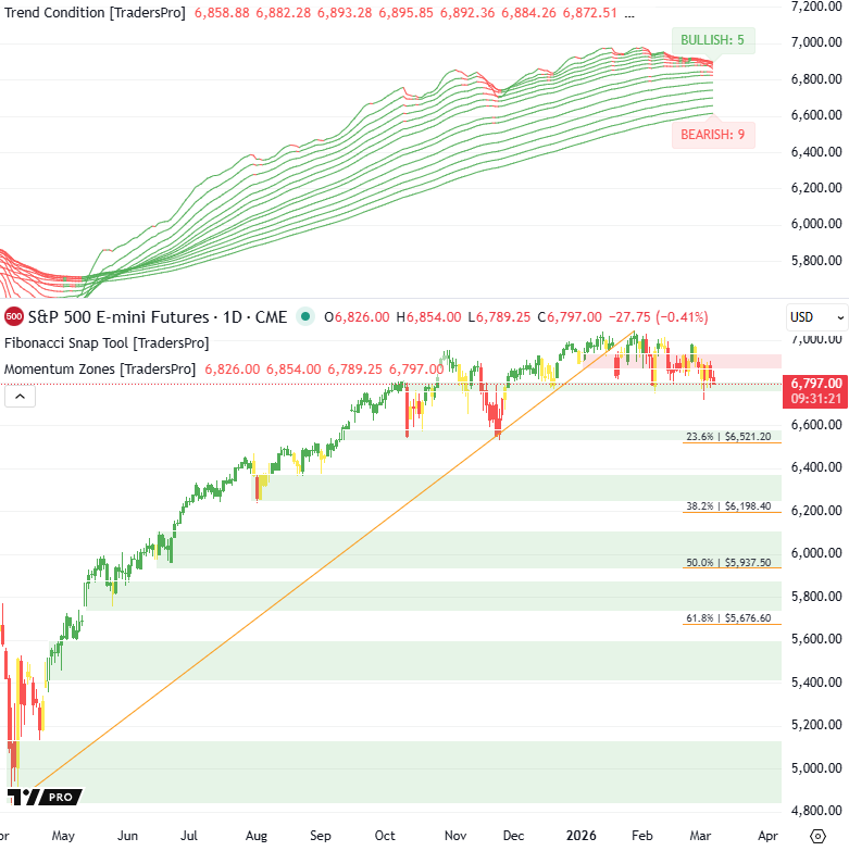 S&P 500 futures are sliding lower again from the upper range, with price drifting down as bearish trend participation remains dominant and momentum stays under pressure.