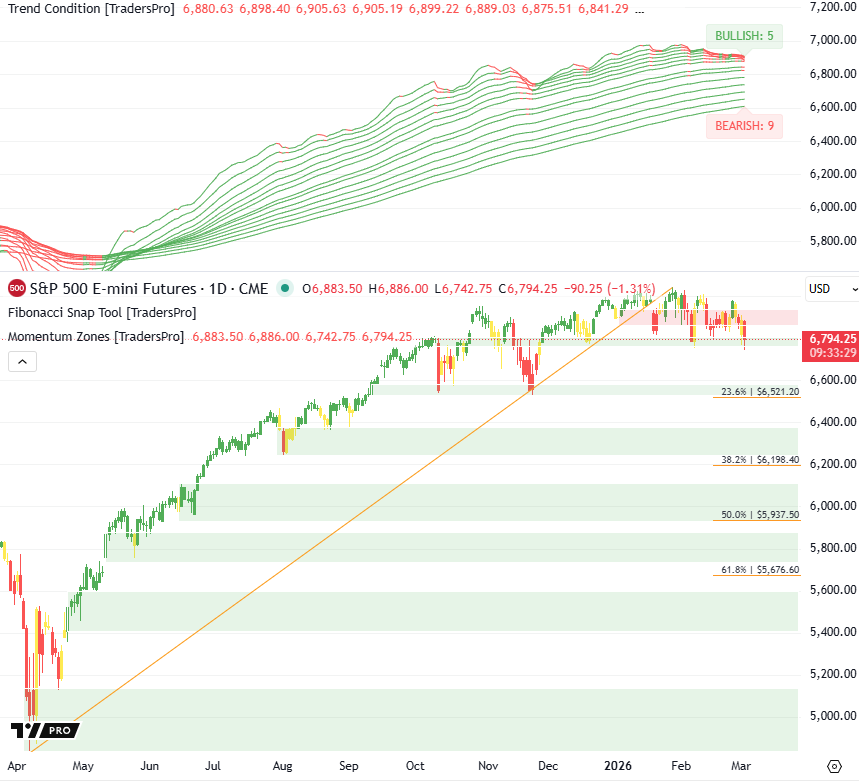 Futures Slide Sharply As Bearish Momentum AcceleratesWhile price still sits above shallow retracement support, repeated heavy selloffs and a negative majority stack confirm the market is in an active corrective phase rather than simple consolidation.New To TradersPro? Market Overview: Bullish/Bearish Trend Analysis Trend Condition: Bullish Trends: 5 Bearish Trends: 9 Trend Condition: Weakening Trend Structure: wide but rolling over at the top Probability Outlook: Overall Market Interpretation: Until price stabilizes and trend alignment improves, rallies are more vulnerable and the market remains biased toward consolidation and pullback behavior rather than clean upside continuation. New To TradersPro? TrendCycle Daily |