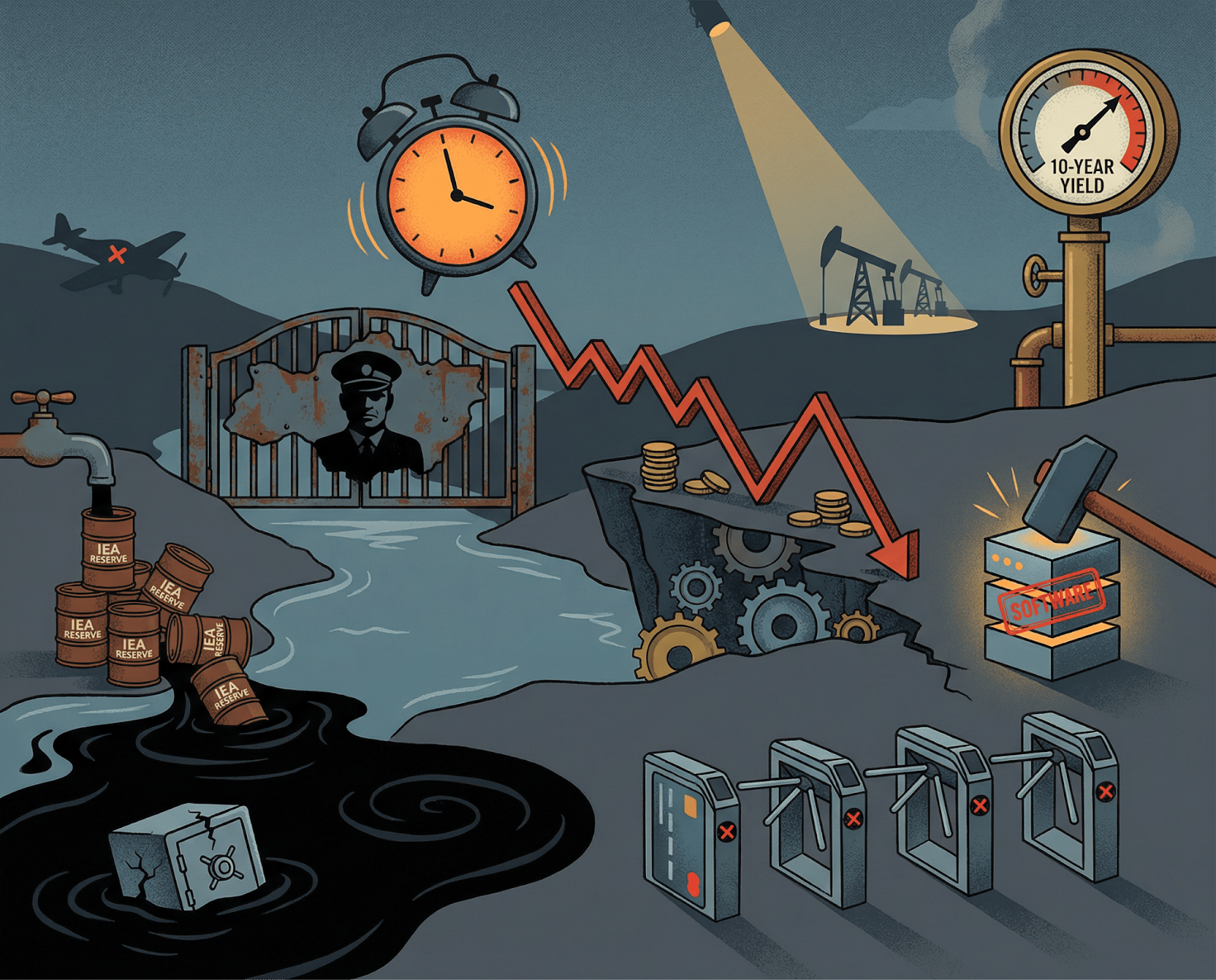 | | | | One supply shock, one credit signal, and a Fed with no room | Mojtaba Khamenei stated the Strait of Hormuz would remain closed as a "tool of pressure." Brent gained 9.2% to close at $100.46, WTI settled at $95.73. The IEA's 400-million-barrel release was absorbed by noon. Drawdowns cannot move ships through a closed Strait. Goldman now assumes Hormuz flows at 10% of normal for 21 days, with recovery beginning around March 21. CME FedWatch has taken September off the table. One cut priced, in December. | Morgan Stanley capped North Haven Private Income Fund withdrawals after investors sought to redeem 11% of assets, returning $169 million, or 45.8% of requests. Blackstone, BlackRock, Cliffwater, and Blue Owl have flagged similar pressure. JPMorgan wrote down software-sector loans. These borrowers cannot get relief from rate cuts that are not coming. | Structural Setup | If Goldman's March 21 timeline holds, energy premiums begin unwinding and the Fed gets a narrow relief window. If Khamenei holds through next week, energy stays embedded. The dot plot shifts toward zero cuts Wednesday. Rate-sensitive sectors reprice at the same time. |