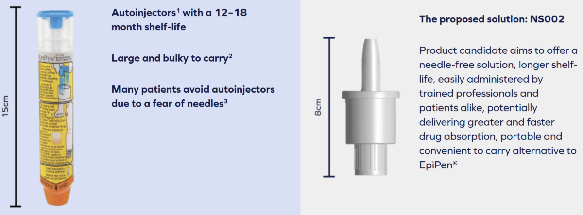 The recently reported NS-002 in anaphylaxis Phase II study showed robust outcomes in all measured metrics, especially the critical ones of Cmax, Tmax, T100pg/ml and percentage of patients with time taken to reach 100pg when compared with EpiPen.
