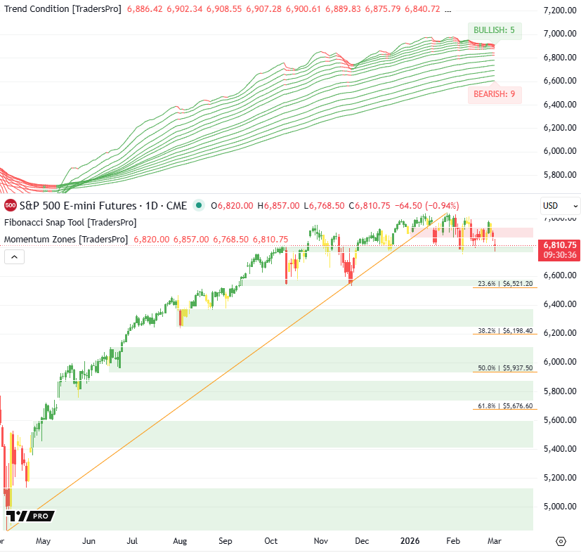 Market Breaks Lower As Trend Alignment DeterioratesWhile price remains above shallow retracement support, the shift to a bearish majority and expanded downside range signal the market has moved from digestion into a more vulnerable corrective phase.New To TradersPro? Market Overview: Bullish/Bearish Trend Analysis Trend Condition: Bullish Trends: 5 Bearish Trends: 9 Trend Condition: Weakening Trend Structure: wide but rolling over at the top Probability Outlook: Overall Market Interpretation: Until price stabilizes and bullish participation rebuilds in the trend stack, rallies are more vulnerable and the market remains prone to continued pullback pressure. New To TradersPro? TrendCycle Daily |