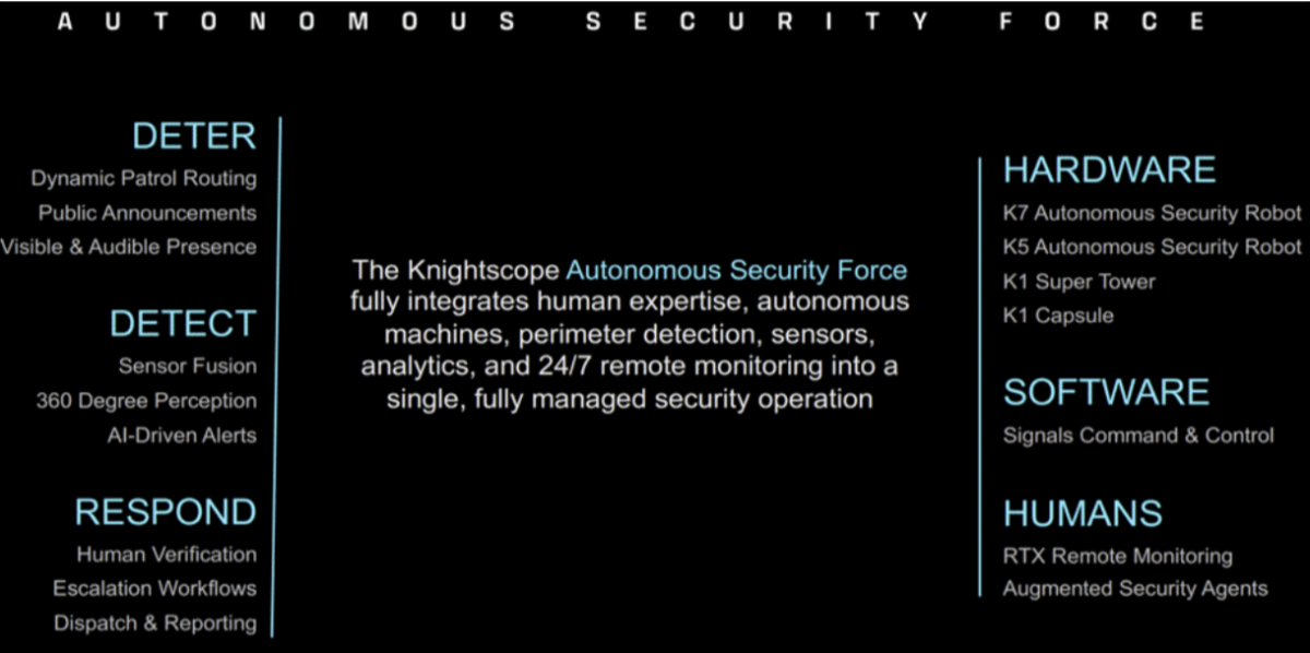 The company is building the nation's first Autonomous Security Force, a fully managed service that combines autonomous robots, AI-driven software, and augmented security agents into one integrated operation that deters, detects, and responds to threats in real time.