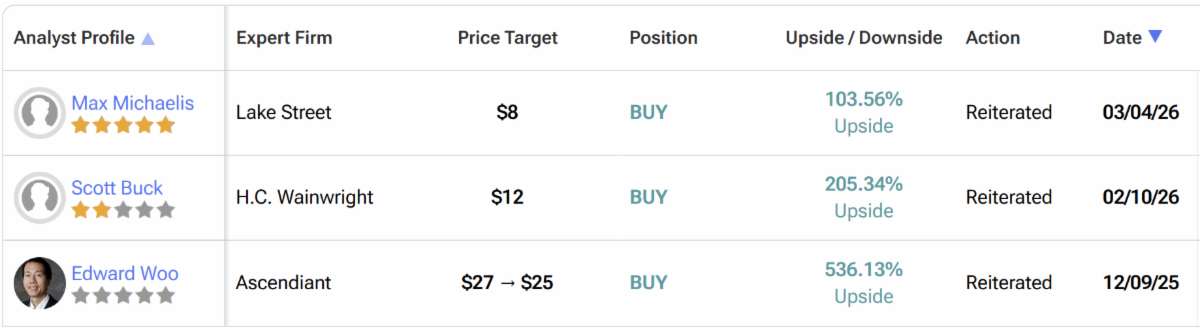 H.C. Wainwright has a $12 price target on 02/10/26, implying 175+% potential upside.