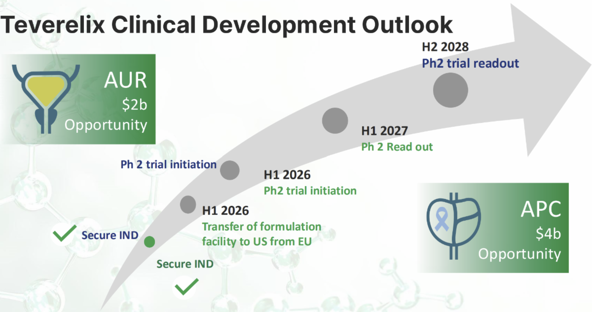 The Company is developing Teverelix® as a best-in-class market product for advanced prostate cancer patients with high CV risk and a first in class product for Acute Urinary Retention Relapse prevention (AURr) collectively representing ~US$6Bn in potential market opp.