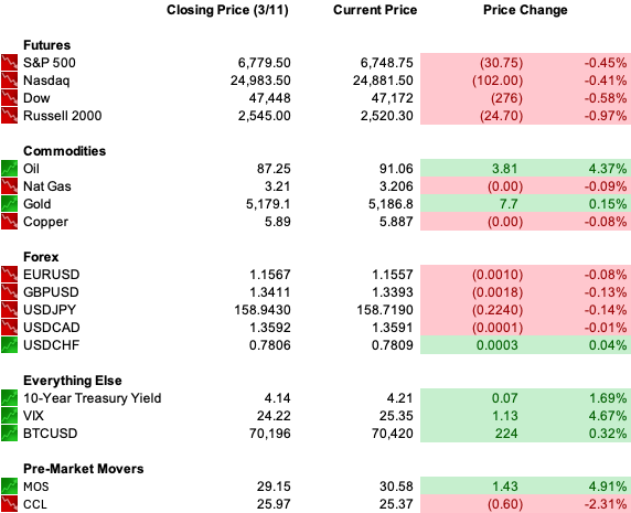 | TQ Morning Briefing | The IEA launched the largest emergency reserve release in its history on Wednesday. By Thursday morning, Brent was back above $100. When the biggest policy backstop in history fails to hold for 18 hours, the market is making a structural statement. | | | | | | | The reserve release bought 18 hours. Then oil remembered what it was pricing. | S&P 500 futures are down 0.9%, Dow futures down 1%. The 10-year yield climbed to 4.224% overnight, its highest in five weeks, as oil resumed its advance and forced a reckoning with the Fed's cutting timeline. WTI is ranging $89-$96 this morning, with Brent touching $101.53 before pulling back. The yen sits at 158.75, approaching the levels that triggered Bank of Japan intervention in mid-2024. | The session has one structural tell: clean energy funds hit record highs on Wednesday while UAL, DAL, and AAL absorbed another leg down from fuel cost and route disruption. Capital repositioned before a ceasefire, not waiting for one. | Wednesday's CPI at 2.4% year-over-year moved nothing. The bond market already knew that data was backward-looking. The 10-year at five-week highs is the faster signal. | Market Implication | If WTI holds above $90 into next week's FOMC, the Fed's statement acknowledges energy inflation explicitly for the first time this cycle. If Brent retreats below $90 on ceasefire signals, rate-sensitive sectors recover their footing. |
