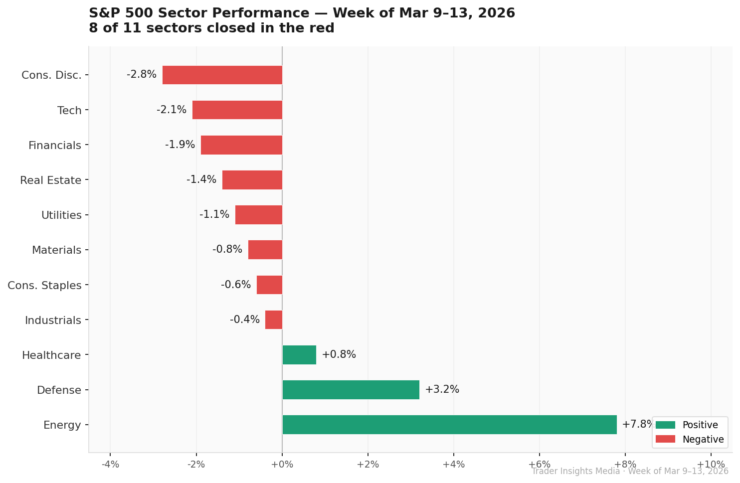 | Bottom Line | Think of this week as a pressure cooker that never got a chance to cool down. | A war in the Middle East is shutting off roughly 20% of the world's oil supply. Brent crude swung from $72 to nearly $120 and settled back above $100, all in two weeks. Gas prices followed. Your wallet noticed. | Wall Street didn't take it well. The Dow, S&P, and Nasdaq all hit their lowest closes since November. 8 of 11 sectors finished in the red. | Meanwhile, Morgan Stanley quietly capped fund withdrawals, a sign that private credit, one of the hottest trades of the past decade, is starting to crack. | And tech? Atlassian cut 10% of its staff for AI. An AI tool knocked Amazon's cloud offline for 13 hours. | Energy and defense held up. Almost everything else didn't. | Stay focused. This isn't over.