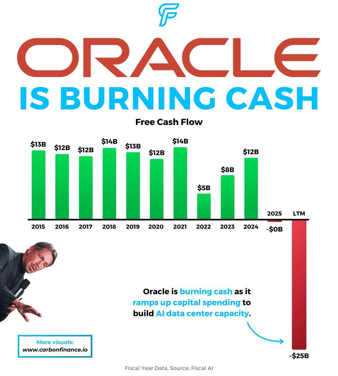 Oracle's free cash flow over the last twelve months has fallen to negative $25B as the company pours money into building out data centers. Management also said it may raise up to $50B via debt and equity financing to expand its cloud infrastructure.