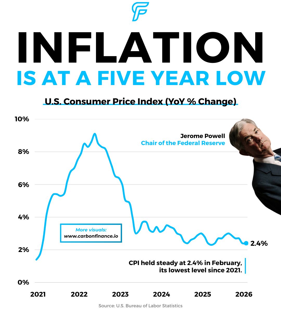 Consumer prices rose 2.4% in February, with core inflation at 2.5%, both in line with expectations. Overall inflation now sits near its lowest level in five years after stabilizing over the past few years.