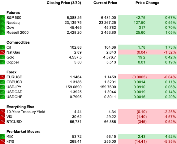 | TQ Morning Briefing | Iran struck a fully loaded Kuwaiti tanker in Dubai's port overnight. Oil jumped nearly four percent. Then the WSJ reported Trump is willing to end the war even if the Strait stays closed. Oil gave it all back. Equity futures are up. Micron (MU) is down in Asia again. The same overnight session produced a ceasefire signal and a tanker attack. The market is going to have to pick one. | | | | | | | Q1 closes with two signals pointing in opposite directions | Futures are higher on the ceasefire headline. European markets followed. Asian markets didn't hold. The Nikkei closed down more than one and a half percent. Chip names led the decline. | Today is Q1's final session. It's ending worse than it started. The Nasdaq and Dow are both in correction. Every Mag 7 name is lower for the year. | Treasury yields stayed lower. Powell told Harvard yesterday the Fed will look through the energy shock. The VIX is still meaningfully elevated. | Market Implication | If Consumer Confidence deteriorates sharply at 10am, the morning's futures gains are on borrowed time. If it's less bad than feared, rate-sensitive names have room through the close. |