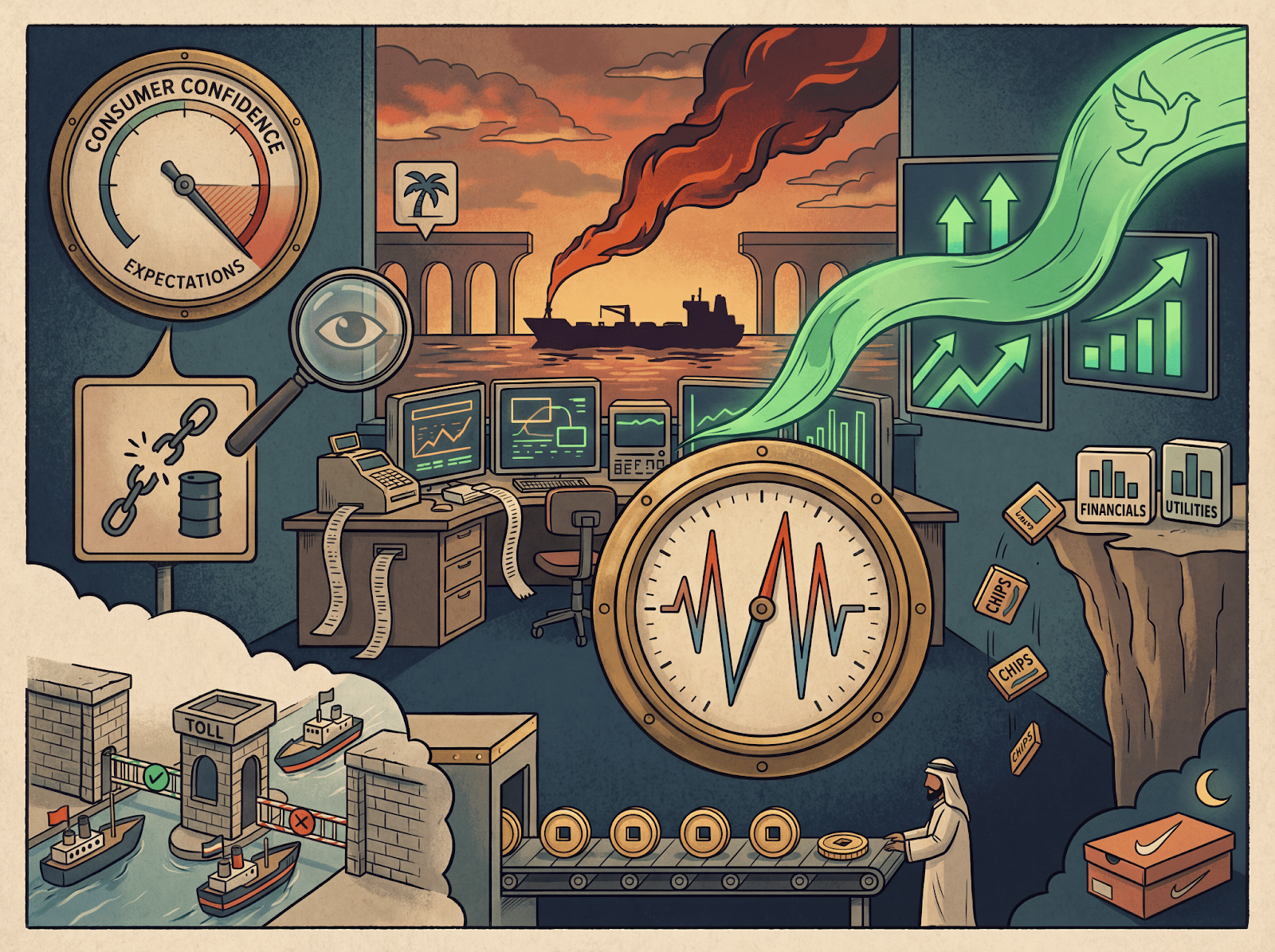 | | | | | Iran hit a tanker in Dubai. Not the Strait. Dubai. | The Al-Salmi wasn't in the Strait. It was in Dubai Port's anchorage zone. Iran's reach now extends well past the chokepoint into the Gulf itself. On the same day, Chinese-flagged vessels were clearing the Strait with Iran's blessing. The terms of passage in the Gulf today depend on who's asking. | Consumer Confidence prints at 10am. The Michigan final showed expectations at multi-year lows. The Conference Board's Expectations component has fallen below 80 before every recession since 1990. When it breaks that level, a downturn has followed within twelve months in each instance. | Watch Signal | If Expectations break hard today, the names that price it first are DAL, UAL, and discretionary retail. Energy and staples hold. |