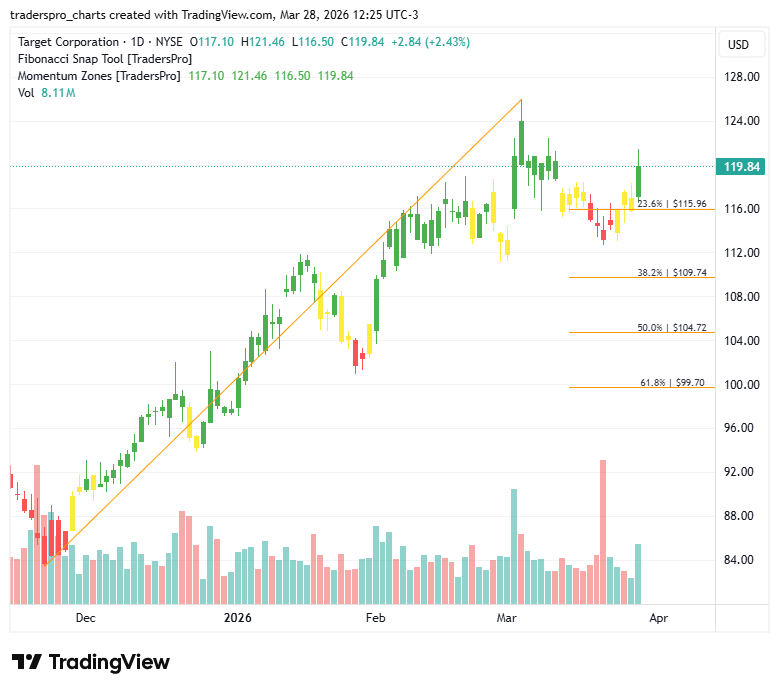 Target Corporation (TGT): Inventory Discipline StrategyAs consumers seek both value and convenience, integrated retail platforms are gaining competitive strength.New To TradersPro? Target Corporation (TGT) is a leading U.S. general merchandise retailer offering apparel, home goods, beauty, food and essentials through its nationwide store network and digital platform. The company combines private-label brands with well-known national products, creating a differentiated value and style proposition. Its omnichannel strategy integrates in-store pickup, same-day delivery, and curbside services, making convenience a central part of the customer experience. Growth is being supported by disciplined inventory management, renewed focus on core categories, and digital fulfillment efficiency. Target has invested in same-day services and owned brands that drive traffic and margin differentiation. As consumers balance value and discretionary spending, the company’s mix of essentials and trend-driven merchandise helps it adapt to shifting demand patterns. Retail remains sensitive to inflation trends and consumer confidence, but improving supply chain normalization and promotional discipline are helping stabilize profitability across the sector. Household budgets continue to prioritize essentials, while seasonal and exclusive collaborations can stimulate incremental demand. E-commerce integration with physical stores remains a competitive advantage, especially as shoppers expect flexible fulfillment options. On the chart, shares recently printed a confirmation bar with increasing volume, signaling renewed buyer participation. That move pushed price into the momentum zone, where expanding demand often sustains upside as selling pressure eases and participation broadens. Because retail stocks can react quickly to earnings reports and consumer sentiment shifts, risk management is essential. A trailing stop rises alongside price, helping protect gains while allowing participation in the broader trend. Traders can anchor that stop to Fibonacci retracement levels and adjust it using the Fibonacci snap tool as new highs form, maintaining structure and discipline. For more information about this company visit their official website. New To TradersPro? Performance |