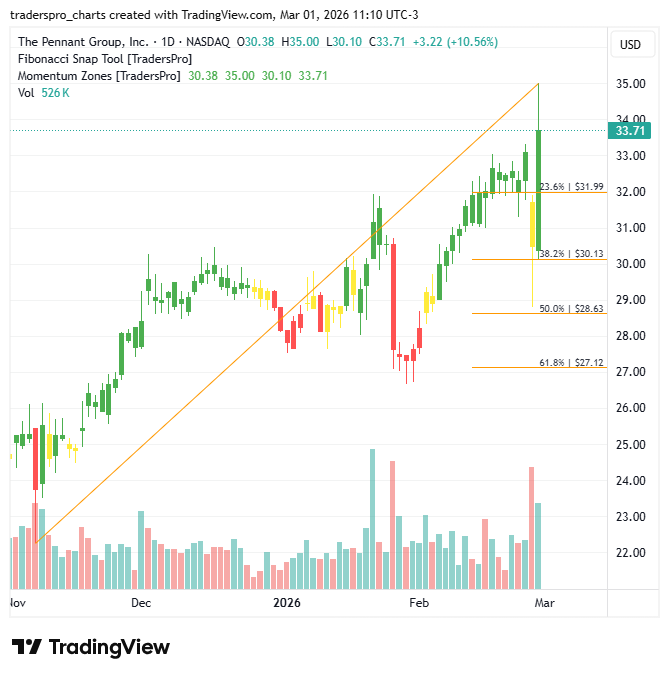 The Pennant Group, Inc. (PNTG): Home Based Care Drives ExpansionAs demographic trends reshape healthcare, home health and hospice providers are positioned for sustained demand growth.New To TradersPro? The Pennant Group, Inc. (PNTG) is a healthcare services company focused on home health, hospice, and senior living operations across the United States. The company operates through a decentralized model, supporting local leaders who manage care delivery in their communities. Its core services include skilled nursing, therapy, hospice care, and assisted living, all positioned within the broader aging demographic trend that continues to reshape healthcare demand. Growth is being driven by an aging population and the increasing preference for care delivered in home-based and community settings. As healthcare systems look to reduce hospital stays and manage costs more effectively, home health and hospice services are becoming central to patient care strategies. The Pennant Group has expanded through acquisitions and organic growth, strengthening its regional footprint while focusing on operational efficiency and quality metrics. Healthcare reimbursement dynamics remain important, particularly Medicare and Medicaid policies that shape revenue visibility. However, the shift toward value-based care and cost containment often favors providers that can deliver quality outcomes in lower-cost settings like home care. Labor availability and wage pressures continue to be industry considerations, but demand for skilled care services remains structurally supported by demographics. On the chart, the stock recently printed a confirmation bar with increasing volume, signaling renewed buyer interest. That move carried price into the momentum zone, where trends often strengthen as demand begins to outpace supply and participation broadens. As the trend develops, protecting gains becomes critical. A trailing stop is designed to move higher as the stock rises, helping manage risk while allowing the position to remain open during continued upside. Traders can anchor trailing stops to Fibonacci retracement levels and implement them using a Fibonacci snap tool, adjusting as new price structure forms. For more information about this company visit their official website. New To TradersPro? TrendCycle Daily |