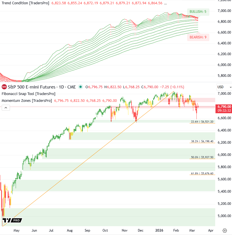 S&P 500 futures are drifting lower again after the breakdown, with price pressing down near the lower edge of the upper range while bearish trend participation remains dominant.