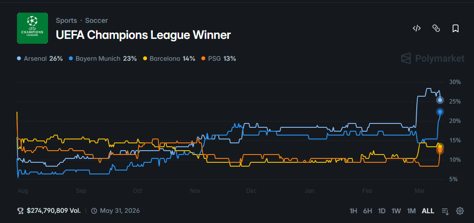 Polymarket traders are pricing in a 23% chance of Bayern Munich winning the Champions League. |