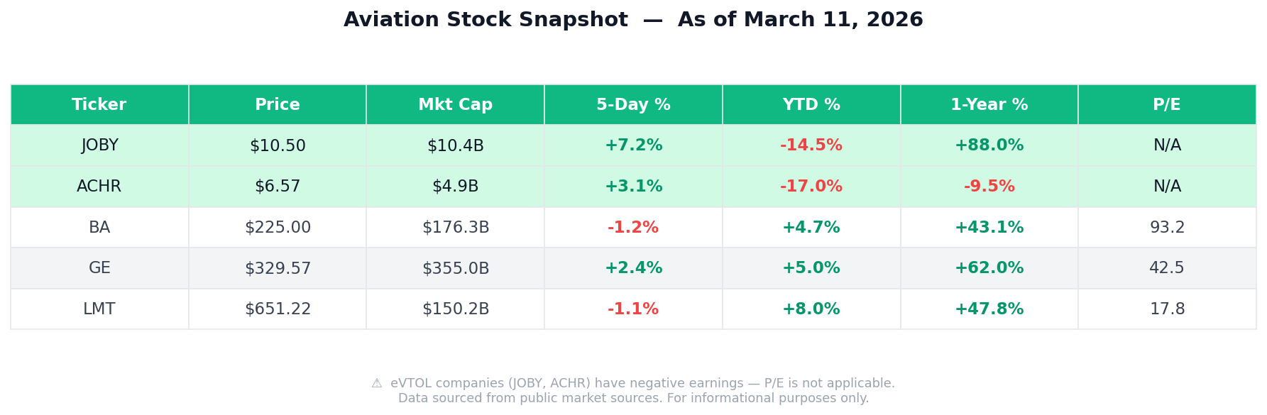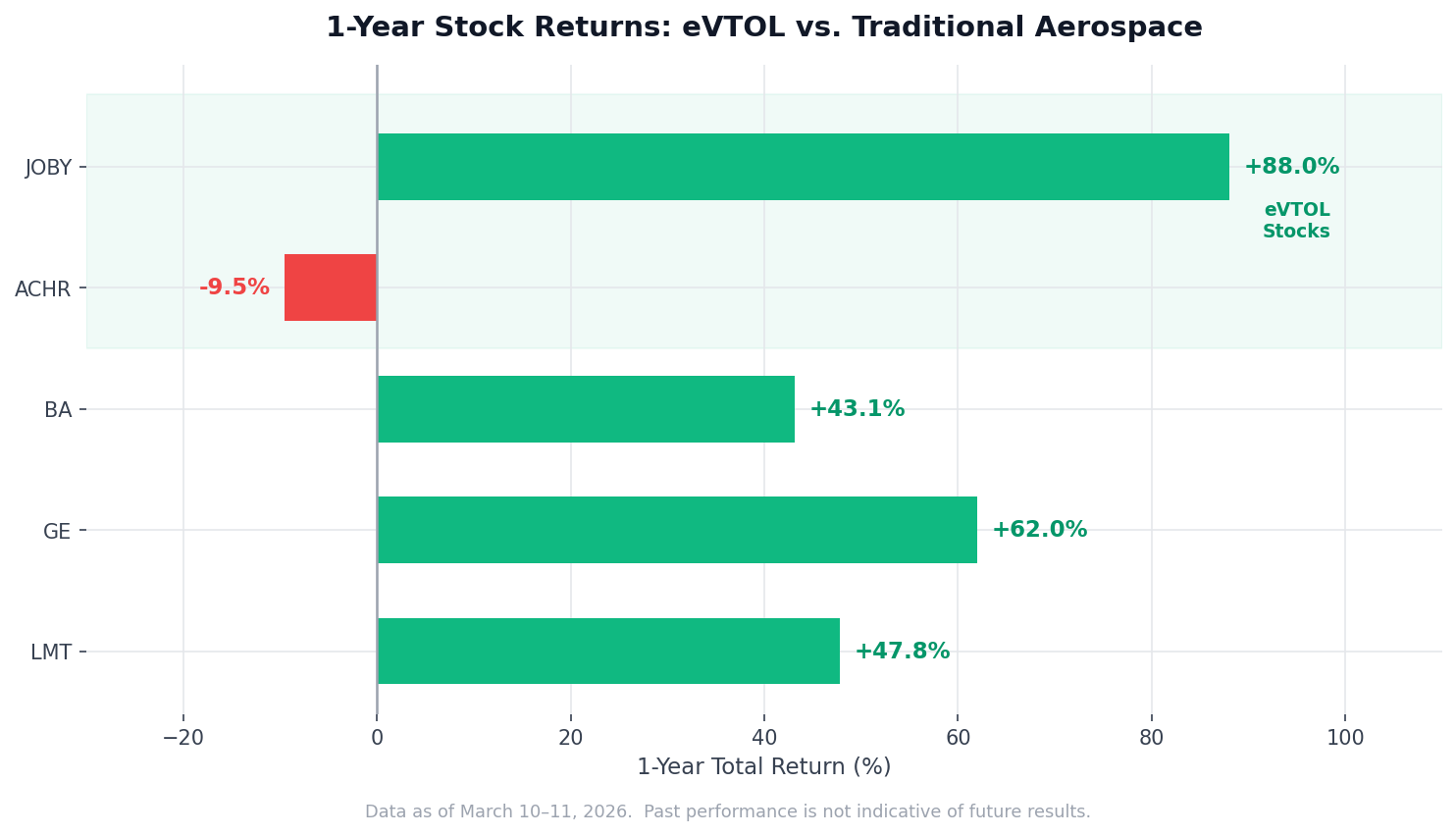 If you prefer less speculation and more stability, the traditional aerospace names are worth a look too. Boeing, GE Aerospace, and Lockheed Martin all give you aviation exposure without the pure eVTOL bet. GE Aerospace has been one of the standout performers in the sector, up over 60% in the past year. |