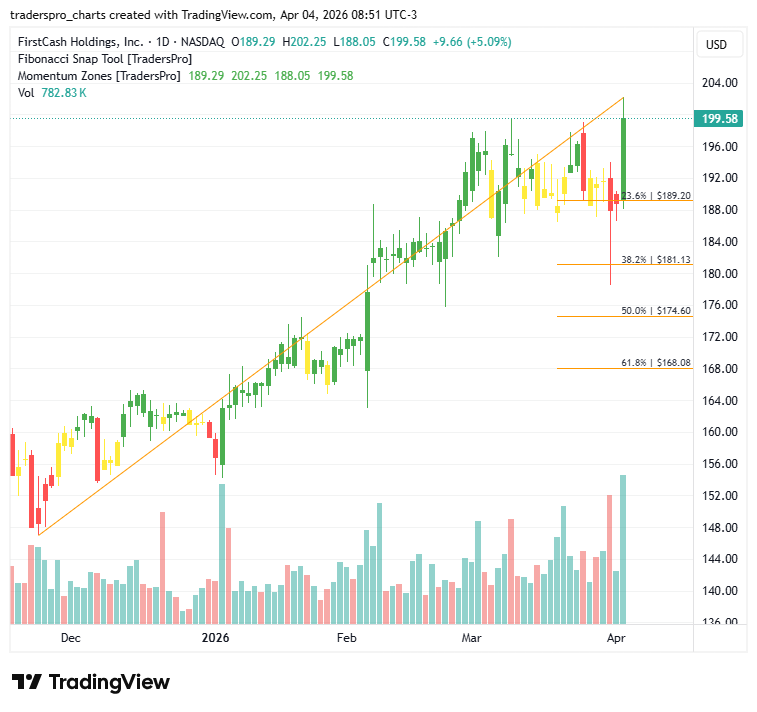 FirstCash Holdings, Inc. (FCFS): Collateral Based Lending StrengthAs traditional credit tightens, collateral-based lending providers are seeing renewed customer demand.New To TradersPro? FirstCash Holdings, Inc. (FCFS) is a leading international operator of retail pawn stores and a provider of point-of-sale payment solutions. The company generates revenue through collateralized pawn loans, retail merchandise sales, and consumer lending services across the United States and Latin America. Its business model centers on short-term, asset-backed lending that serves customers seeking liquidity without traditional bank credit. Growth is being driven by steady demand for alternative financial services and disciplined store expansion in key markets. As consumers navigate higher living costs and tighter credit conditions, pawn lending offers immediate access to cash secured by personal items. FirstCash also benefits from strong merchandise turnover, selling forfeited goods at competitive prices through its retail footprint. Shifts in consumer spending patterns have reinforced demand for value-oriented retail and flexible credit options. Elevated interest rates and cautious bank lending standards can push more customers toward collateral-based financing. At the same time, consistent employment trends support repayment behavior, helping stabilize loan portfolios. The company’s diversified geographic presence provides resilience across economic cycles. On the chart, shares recently printed a confirmation bar with increasing volume, signaling renewed accumulation. That move carried price into the momentum zone, where strengthening demand can support continued upside as institutional participation expands. Because financial service stocks can respond quickly to shifts in credit conditions and consumer trends, managing risk is essential. A trailing stop rises alongside price, helping protect gains while allowing participation in further advances. Traders can anchor that stop to Fibonacci retracement levels and adjust it using the Fibonacci snap tool as new highs form, maintaining structure and discipline. For more information about this company visit their official website. New To TradersPro? Charts |
