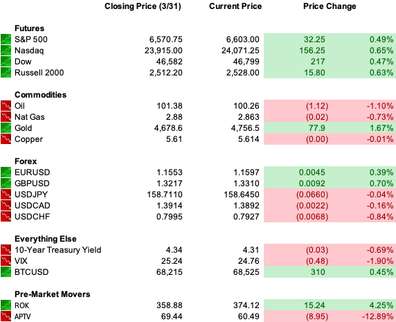 | TQ Morning Briefing | Trump signaled an exit from Iran. Wall Street closed Q1 up sharply. The Strait is still closed, and futures this morning price a shorter war, not an open Strait. | | | | | | | Futures are higher but far more muted than yesterday's session. VIX is pulling back. | Yields are slipping lower on reduced war risk and early downturn pricing. Gold is rallying on safe-haven demand. | Yesterday was one trade: war duration shrinks, rate plays recover. But energy desks sat it out. When oil doesn't move with equities on an exit signal, pay attention. | WTI closed above triple-digits. It's pulling back this morning. | Market Implication | Yesterday's session priced a shorter war. It didn't price an open Strait. If ISM Prices Paid picks up this morning, the market will have to square a relief rally with a price signal that hasn't moved. |