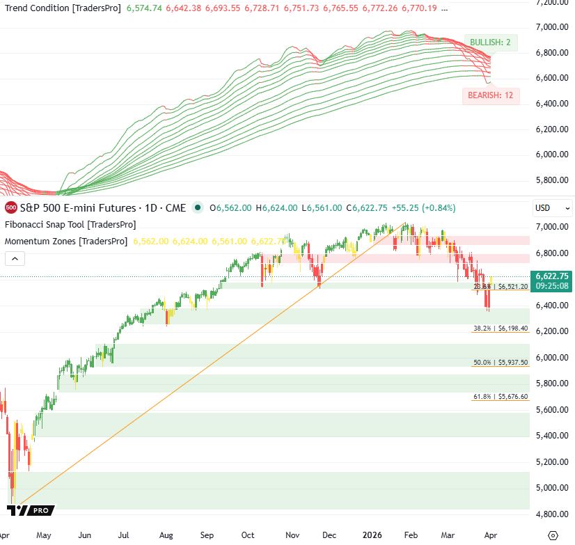 S&P 500 futures are rebounding off the 23.6% retracement area, with price pushing higher on a strong green candle while the trend stack remains heavily bearish.