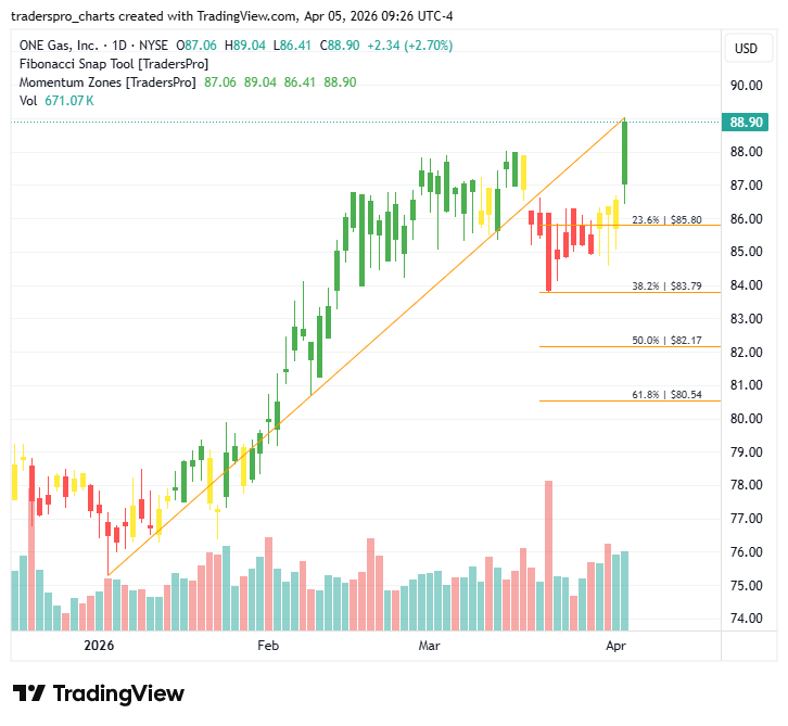 Growth is being driven by steady customer additions in expanding metropolitan areas and continued investment in system modernization. Population migration toward lower-cost regions has supported demand for utility services, while pipeline replacement programs and safety upgrades create long-term capital deployment opportunities. ONE Gas benefits from regulatory frameworks that allow recovery of infrastructure spending through approved rate adjustments. Energy markets remain focused on reliability and affordability. Natural gas continues to serve as a primary heating and industrial fuel source, especially in regions where electrification remains gradual. Infrastructure resilience and safety initiatives are priorities for regulators, reinforcing capital spending plans. While commodity price volatility can influence customer bills, regulated utilities like ONE Gas are structured to reduce direct exposure to fuel price swings. On the chart, shares recently printed a confirmation bar with increasing volume, signaling renewed institutional participation. That move pushed price into the momentum zone, where strengthening demand can support further upside as buyers gain confidence in the trend. Because utility stocks can respond to interest rate expectations and regulatory decisions, managing risk remains important. A trailing stop rises alongside price, helping protect gains while allowing participation in continued advances. Traders can anchor that stop to Fibonacci retracement levels and adjust it using the Fibonacci snap tool as new highs develop, maintaining structure and discipline. For more information about this company visit their official website. New To TradersPro? Charts |